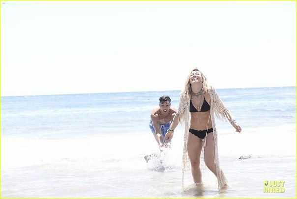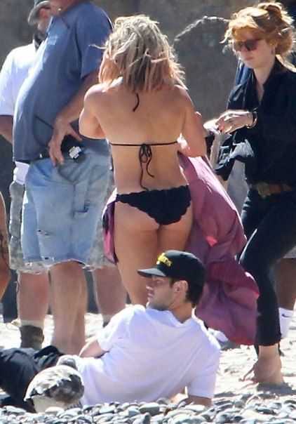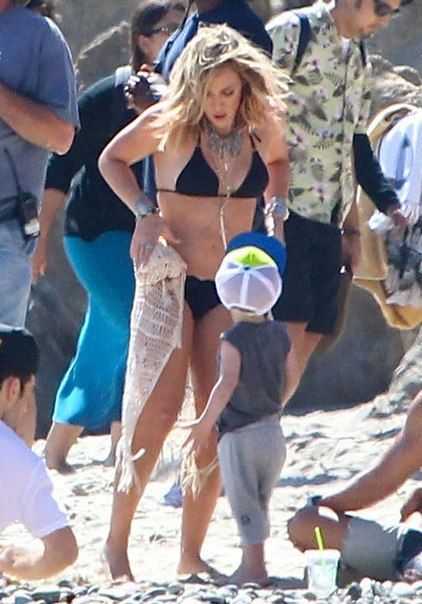 Фото как голая Хилари Дафф играет на пляже с ребёнком.