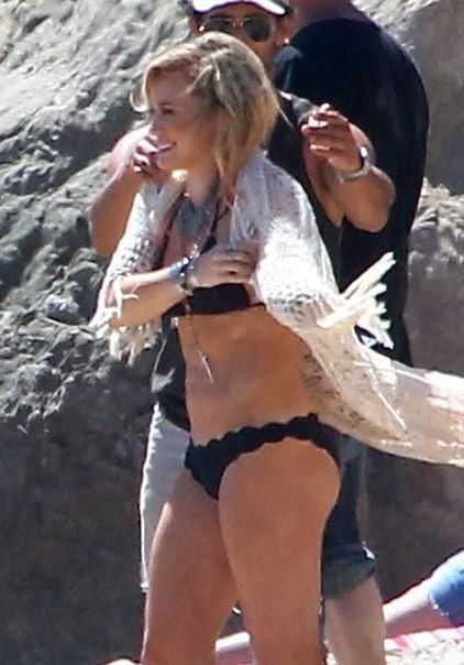 Фото как голая Хилари Дафф играет на пляже с ребёнком.